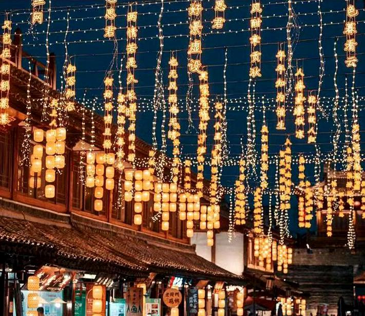 激光灯束下,夜景新地标;月亮星球灯,穿越银河系,瑶池仙女下凡间,洒落“商河”入“温泉”,身穿汉服的七仙女小姐姐,闲庭信步于市集的古道今巷。