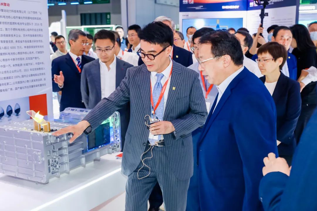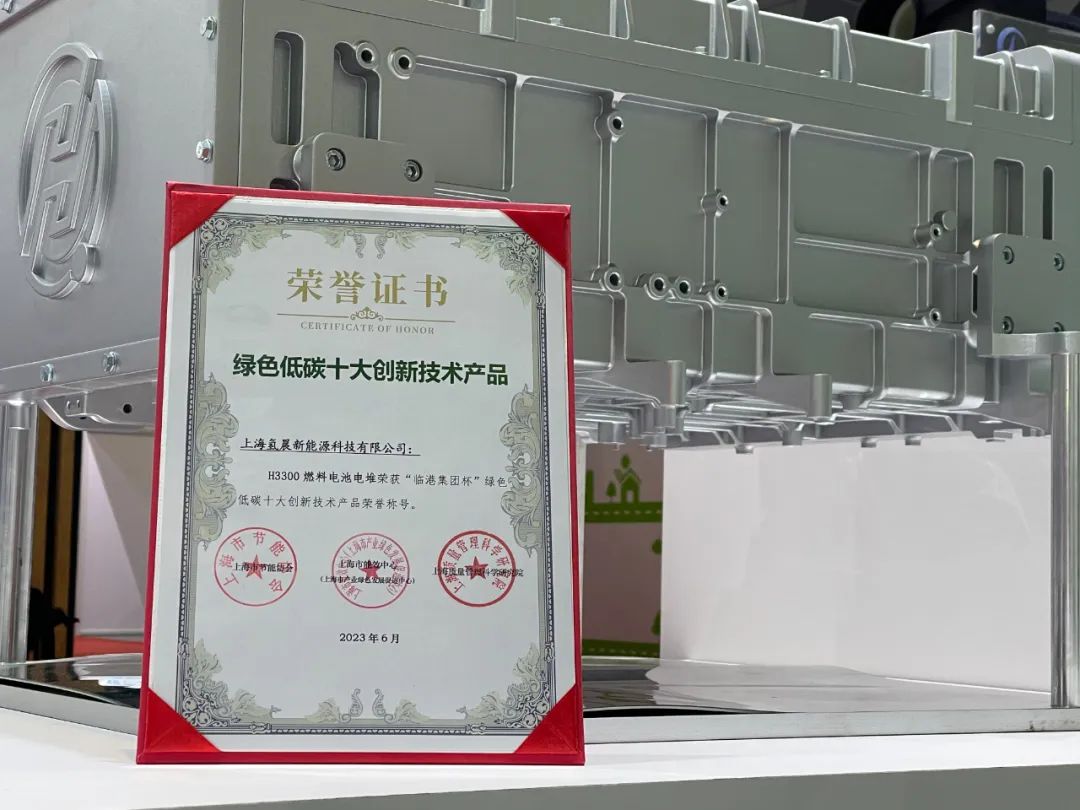 在开幕式前,上海市委副书记,市长龚正等一行领导莅临申能集团“零碳家园”展区参观指导,氢晨科技的300kW燃料电池电堆引来了关注!在申能集团党委书记、董事长黄迪南介绍下,对氢晨科技的产品进行了详尽的了解。临港集团党委副书记、总裁翁恺宁察看了国际氢能谷展区,作为上海唯一氢能特色产业园,聚集氢晨科技在内的30余家氢能产业链上下游企业。临港集团作为上海首个出台绿色发展行动计划的市属国有企业,也是此次上海国际碳中和博览会规模最大、案例最多,展陈方式最多元的参展商,携旗下20大重点园区、4大服务平台,联动60余家园区知名企业以及10余家合作伙伴组团参展。临港集团集中展示在绿色园区建设、绿色产业链构建、绿色建筑打造、绿色场景应用、绿色金融实践、园区绿色生活等多方面的积极示范成果。在临港展区绿色主题活动现场,为进一步加快重点领域绿色低碳新技术产品推广应用,在市经信委和临港集团的指导下,临港集团下属上海质科院联合市节能协会、市能效中心开展“十大创新技术”评选活动。上海氢晨新能源科技有限公司凭借“H3300燃料电池电堆”荣获绿色低碳“十大创新技术产品”荣誉称号。