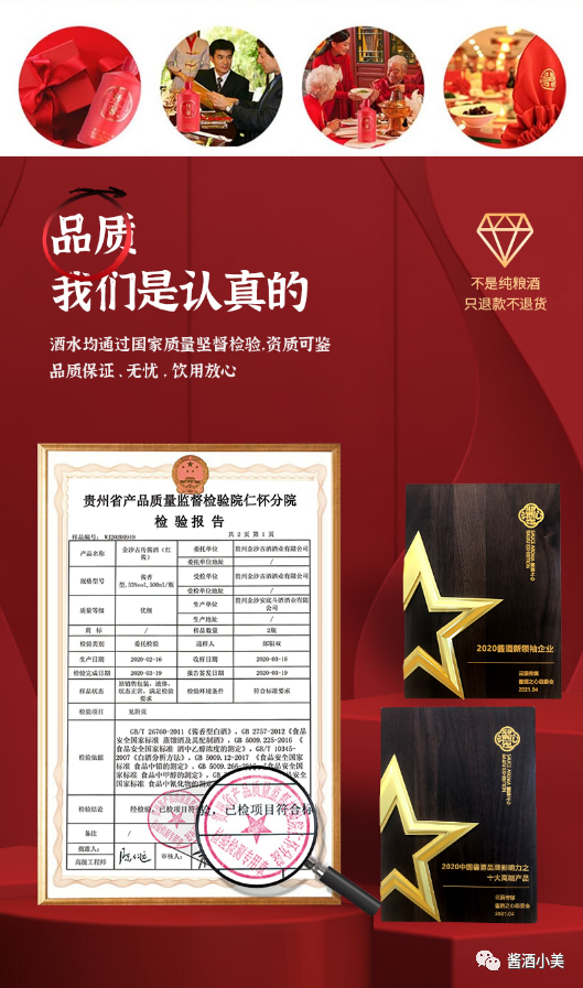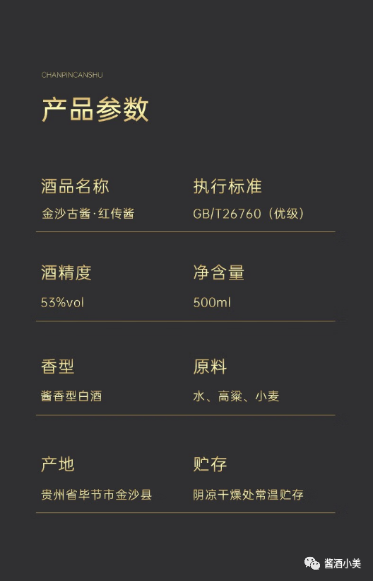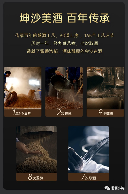 金沙回沙酒微黄透明,无沉淀无悬浮,酱香突出,酒体丰满,细腻幽雅,尾净味长,空杯留香持久,大曲酱香,风格典型金沙回沙酒以小麦制曲,采用两次投料九次。