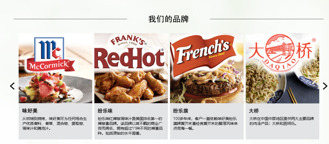 McCormick味好美是有着130多年历史的全球调味品知名企业,知名品牌产品遍及约 150 个国家和地区。进入中国三十多年以来,味好美中国旗下的味好美、大桥以及进口品牌Frank’s RedHot纷乐味、French’s纷乐旗等多个品牌都受到中国消费者的信赖与喜爱。
