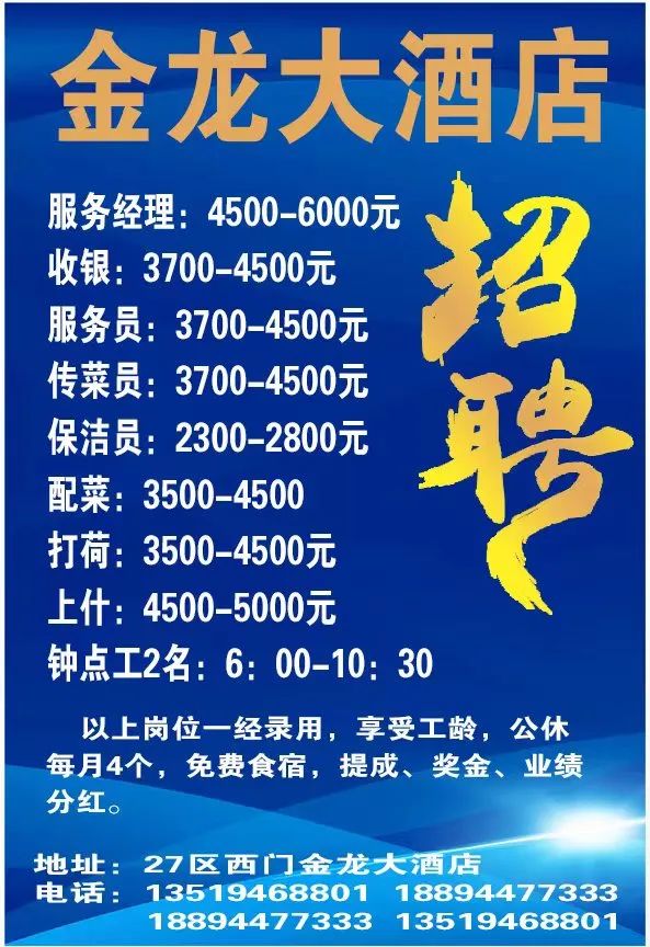 上班时间:每晚7:00到凌晨2:30。夜班服务员两名,上班时间每晚9:00上班到工作结束。收银一名,工资3300加全勤奖金加绩效。主管一名,工资面议。服务员5名,工资3600加全勤奖金加绩效。传菜生2名,2600加全勤奖金加绩效。保洁1名,3200加全勤加绩效。工资3600-4000,每周一早上休息,钟点工两名,工资2500-2800,上班时间:下午5:00–晚上12:00,具体事宜面谈。联系电话:15214153303 18993514913宾馆客房服务员1名,工资3200,正常班不上夜班,每月公休3天,15号发工资,不拖欠,无押金(40岁以下,有工作经验的可以优先)。有意者请联系:18609360606 0935-6911777活轻松好干,只上白班不上夜班,一天只上几个小时的班,工作待遇面谈。服务员一名,(5000-8000)上班时间早上7.30-晚上9点,月公休2天。地址:上海路恒昌国际对面,要求,吃苦耐劳,具体事宜面谈!送货员2名(男性),全职文员1名,女性,要求长期干。电话:13993576815 15393577978年龄25-45岁(个人能力优秀的45+也可以考虑);从事过餐饮行业优先考虑;上班时间:10:00-14:00;16:00-21:00。联系电话:15101919774 18093508302联系方式:15009459499 15097036266