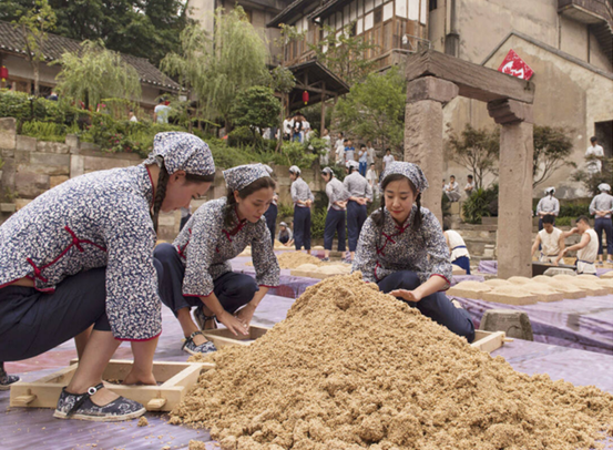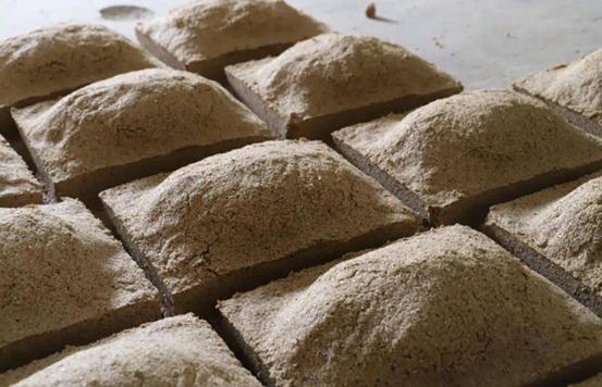 大曲以小麦等原料碾碎打湿,做成方胚,也就是大家熟知的茅台踩曲女工操作,然后放入温室发酵,吸引微生物。