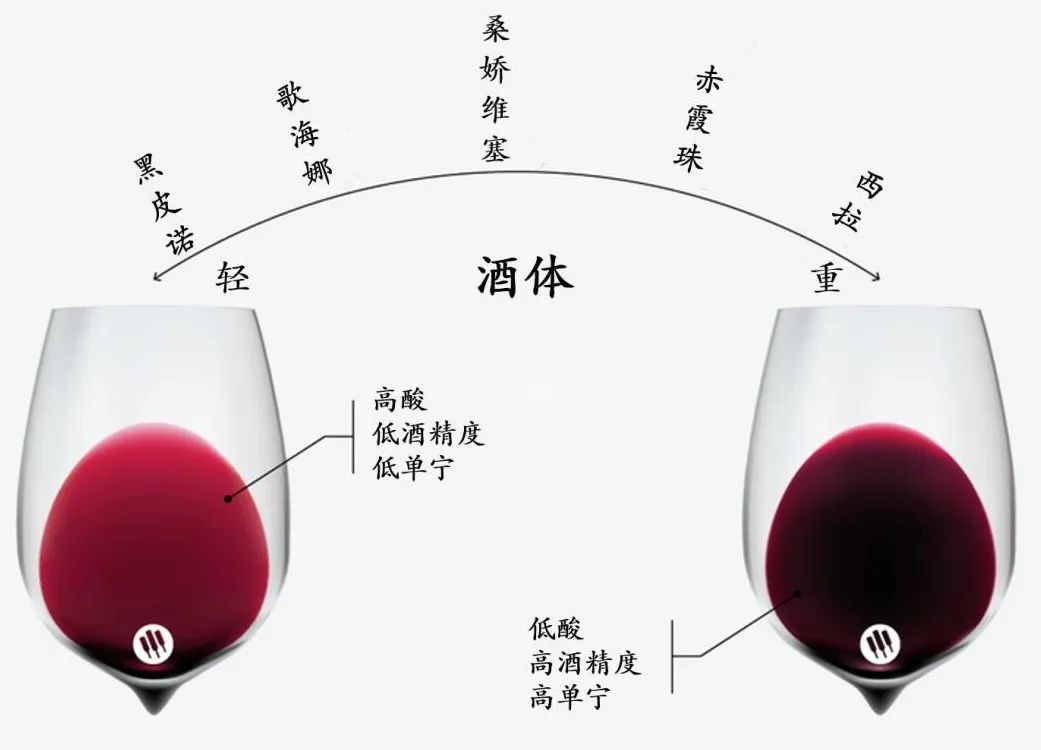 酒体轻的葡萄酒一般酒精度低,酸度高,粘稠度低,口感清新。
