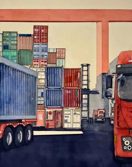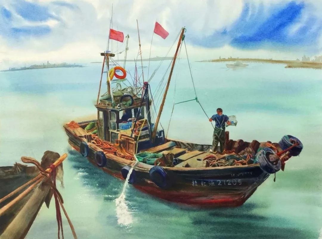 ▲ 陈源瑞《穿梭繁忙的北部湾港》58cm×76cm