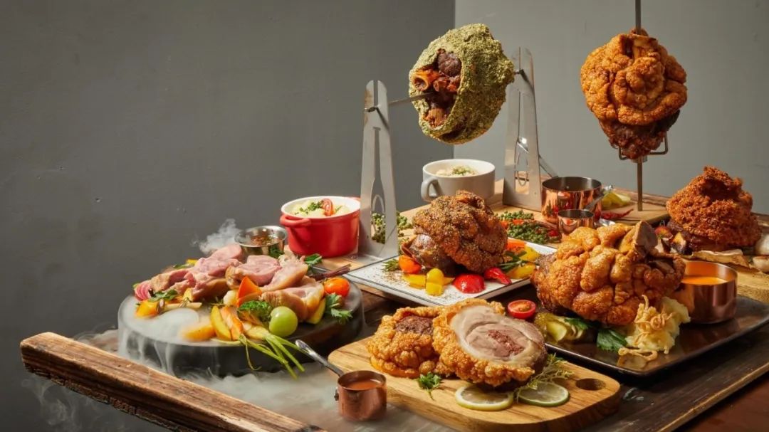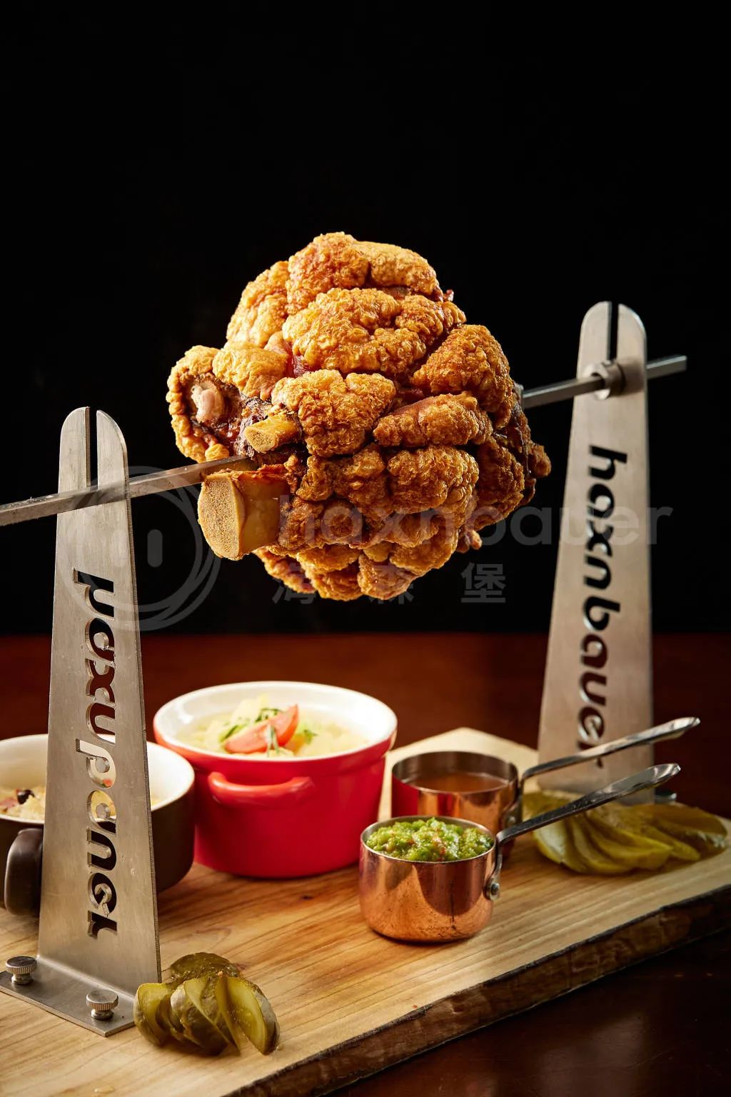 新鲜出炉的猪肘淋上一小杯烈酒,火焰点燃的瞬间,滋滋的烤炙声混着诱人的肉香一齐进发!