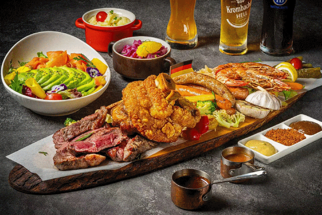 炭火烤西冷牛排、迷迭香火烤黑虎大虾、黑胡椒猪小肘、辛香鸡肉肠、纽伦堡香肠、猪肉芝土肠、德式经典士豆色拉、德式酸椰菜,超丰富!