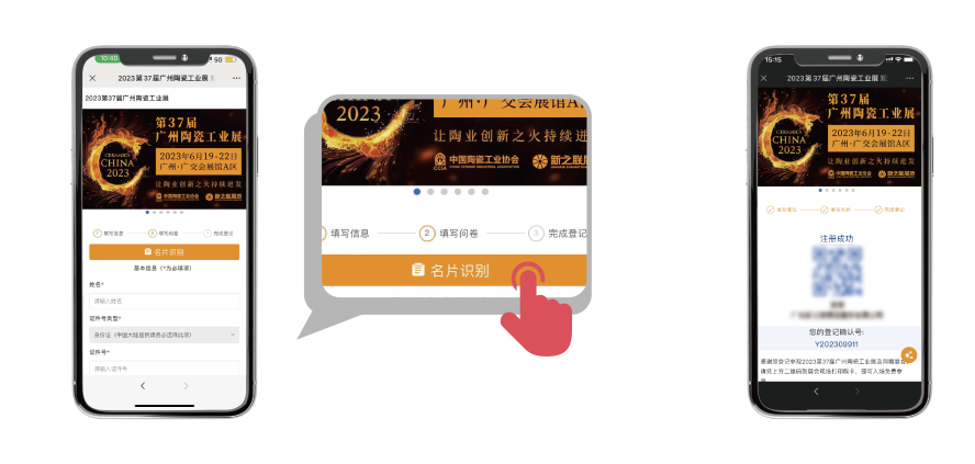 3、点击“名片识别”拍照上传名片,或手动填写个人信息完成调查问卷,生成二维码,凭二维码到办证柜台打印《参观证》