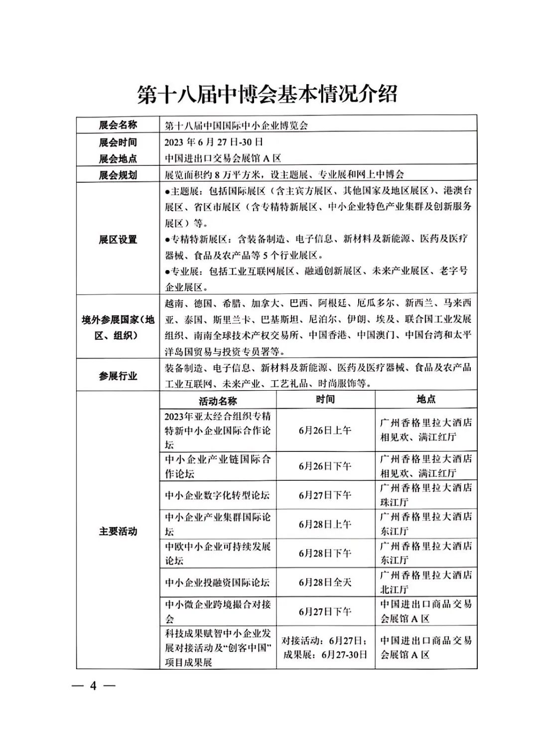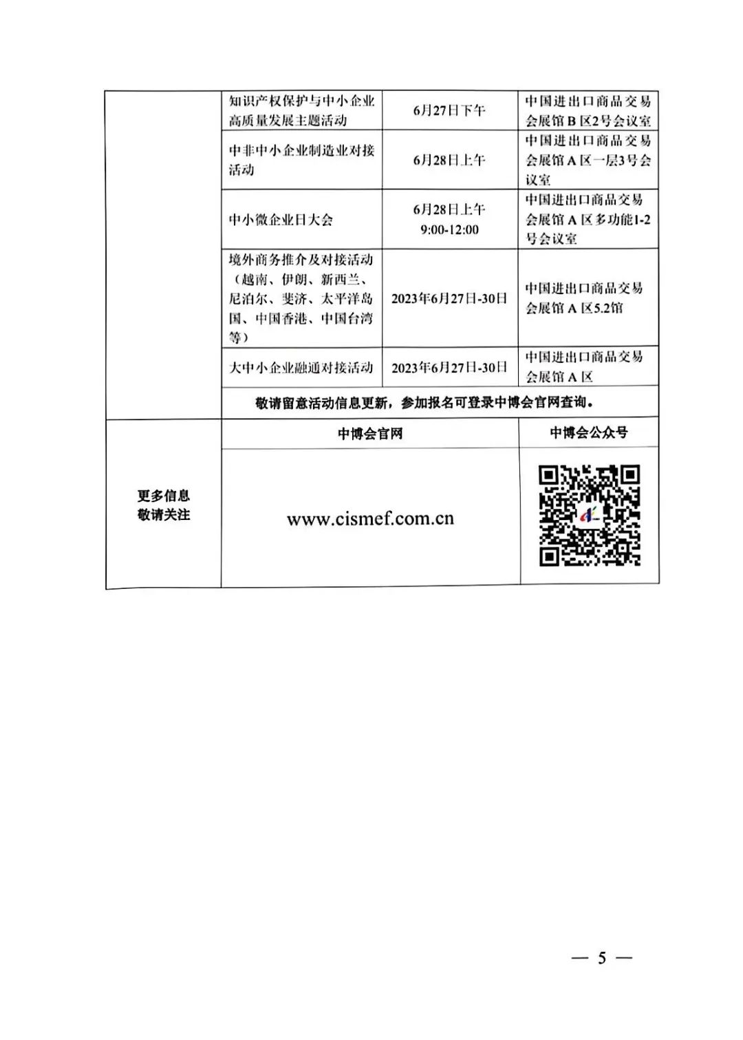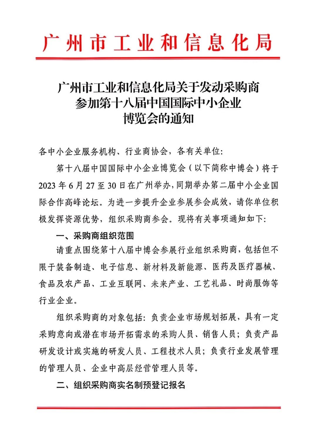 第十八届中国国际中小企业博览会将于2023年6月27至30日在广州举办,广州市工信局现组织征集采购商参展。请有意向的单位积极参与,具体流程及报名方式请查看附件。(花费2分钟进行小程序扫码报名即可)