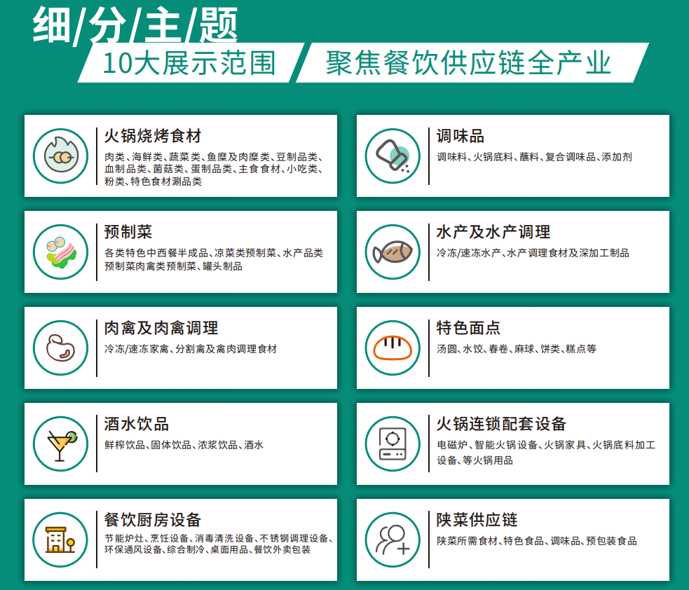 本次展会立足餐饮全产业链,涵盖水产及水产调理、肉禽及肉禽调理、速冻米面、预制菜、酒水饮品、调味品、火锅烧烤食材、陕菜供应链、乡村振兴、餐饮设备、餐饮食材加工与包装、供应链服务等,展品品类又上新高,势必成为西北今年最火的餐饮专业展,开启餐饮品牌新增长!参展企业带来的2万款新品爆品集中展示,通过这次展会的贸易对接,将进入西北各大餐饮店、火锅店、小吃、烧烤、快餐等各个业态的菜单中,刷新西北餐饮业的“新内容”,为西北地区广大消费者带来新的消费体验。