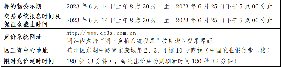 肇庆市端州区端州八路东侧5区(土名龙船头)厂房 | 面积约2056㎡(其中厂房建筑面积1196㎡,板房建筑面积860㎡) | 厂房每月每平方米14元,板房每月每平方米6元 | 6年 | 262848元(大写:人民币贰拾陆万贰仟捌佰肆拾捌元整) | 竞得价的三个月租金 |