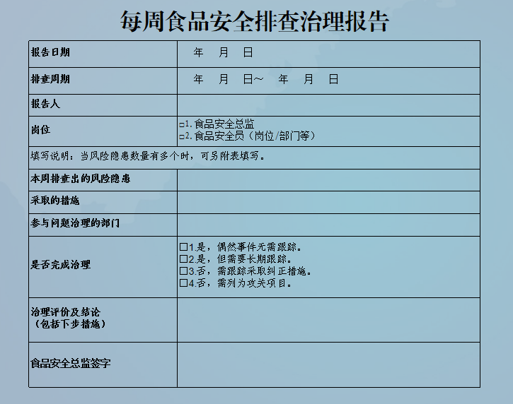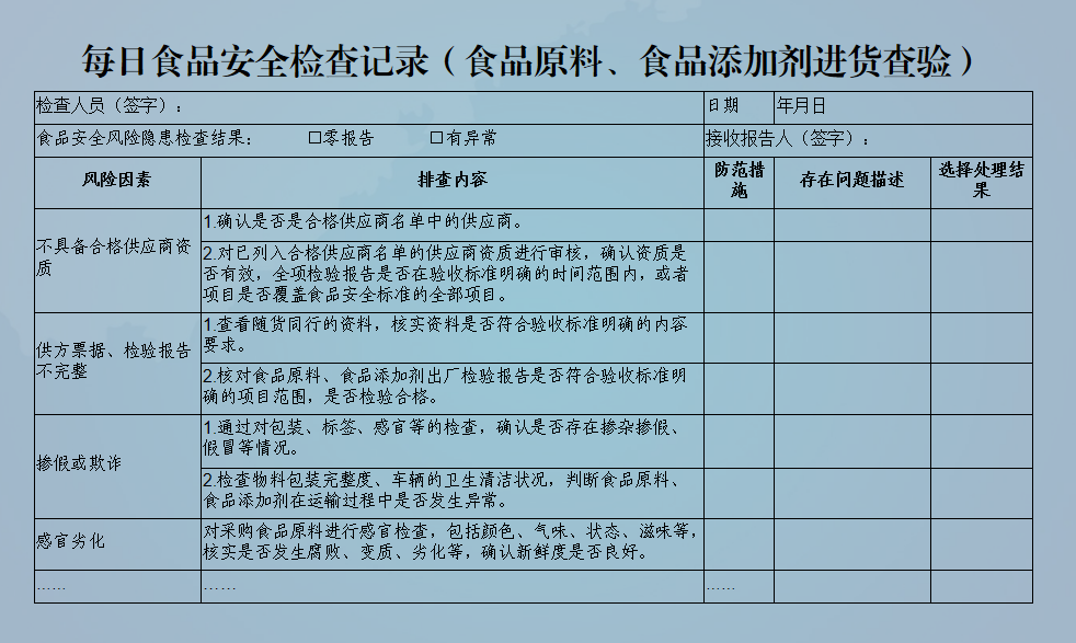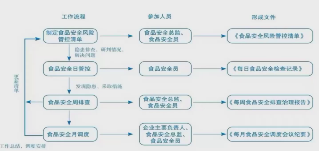 古人云:“兵马未动,粮草先行”,企业作为一个团队,自然要将如何养护自己的员工放在重要的位置上,企业食堂作为存放“粮草辎重”的重地便成了维系企业平稳发展的重中之重。根据《食品安全法》、《餐饮服务食品安全操作规范》等法律、规范规定:从事接触直接入口食品工作的食品生产经营人员应当每年进行健康检查,取得健康证明后方可上岗工作。以公司为单位,填写食品从业人员台账并加盖公章后,组织员工携带身份证前往就近的医院或卫生院办理。查验记录制度是食品生产企业建立追溯体系的具体手段。一方面有利于食品可追溯,确保监管链条不断,另一方面也可以保护生产经营企业自身的权益。《食品安全法》第42条规定,食品生产经营者应当建立食品追溯体系,保证食品可追溯。如何做到食品可追溯,做好相应的信息记录,是必不可少的措施。根据区市场监管局统一印刷、下发的进货查验记录进行填写,务必做到真实、准确。企业应当建立食品安全日管控制度。食品安全员每日根据风险管控清单进行检查,形成《每日食品安全检查记录》,“日管控”是食品生产企业落实主体责任,防控风险隐患的基础工作。食品生产企业应根据不同环节可能存在的食品安全风险隐患,明确各岗位风险排查重点,制定各岗位风险清单和针对不同风险隐患应采取的防控措施,并以此为基础设计好相关记录格式,做好各岗位食品安全员的培训,扎实做好每日食品安全风险管控工作。“周排查”是食品生产企业系统解决已经发现的食品安全问题和防范食品安全风险隐患的重要手段。可以通过现场和会议两种方式开展。食品生产企业应每周对“日管控”中发现问题进行梳理、分析、总结,统筹安排、整体布局,协调各个相关部门,解决疑难问题。对反复出现的问题,要研究解决具体措施,形成治理报告月调度”是食品生产企业主要负责人贯彻《食品安全法》,落实企业食品安全管理制度,对本企业的食品安全工作全面负责的具体体现。企业应当建立食品安全月调度制度。企业主要负责人每月至少听取1次食品安全总监管理工作情况汇报,对当月食品安全日常管理、风险隐患排查治理等情况进行工作总结,对下个月重点工作作出调度安排,形成《每月食品安全调度会议纪要》民以食为天,食以安为先
