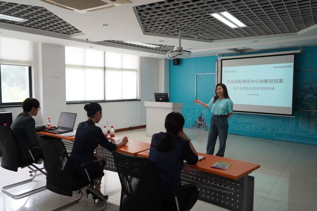 杭州国际博览中心旅游服务部副总监夏侯颖向学生们介绍了杭州国际博览中心及讲解员岗位信息,并在图书馆创富中心路演教室进行现场面试,优质的实习机会和福利待遇吸引了众多同学参加面试。