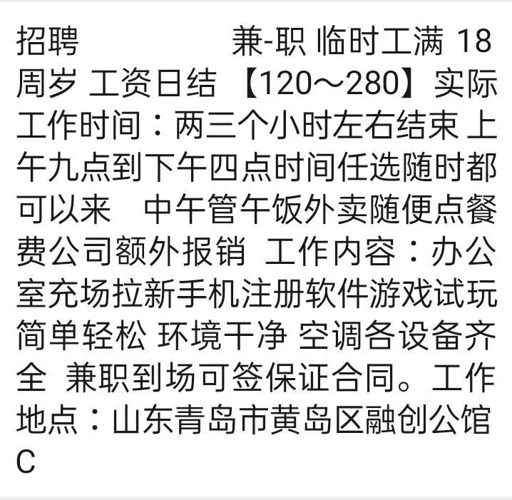 志愿者招聘 工作地点:青岛国际会展中心(崂山区) 工作时间:6月1819号 7:30-17:30(17号下午培训2小时)连续2天做完 招聘岗位:门禁、协助、引导、举牌等工作内容,具体岗位到达现场后具体分配 工作要求:不迟到早退、服从现场工作安排,积极工作,不偷懒。能接受统一的工作装!不能服从安排,中途走人的一律无工资!报名提交姓名电话生活照片 工资待遇:100元/天 工资结算:最后一天下班现场结算