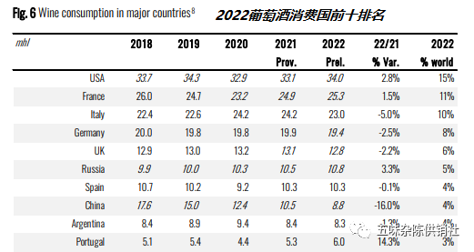 全球排名前十消费国:美国34亿升,法国25.3亿升、意大利23亿升、德国19.4亿升、英国12.8亿升,俄罗斯10.8亿升,西班牙10.3亿升、中国8.8亿升,阿根廷8.3亿升,葡萄牙6亿升。