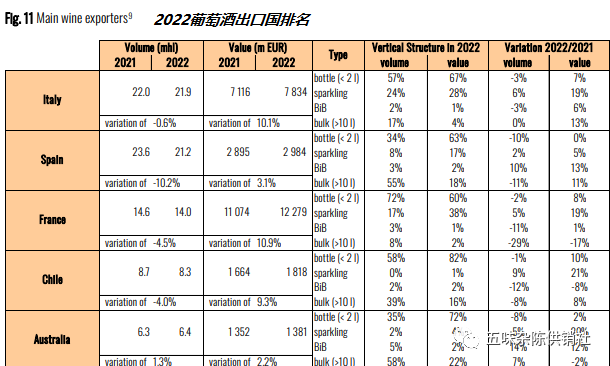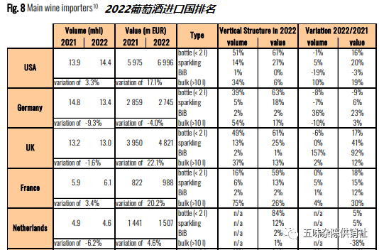 德国(第二大进口国)的进口量13.4亿升,进口值达27亿欧元,较2021年分别下降了9.3%、4%。