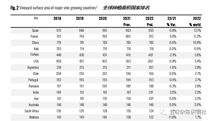 2022年,全球葡萄园种植面积预估730万公顷,略低于2021年(-0.4%)。排名前四的国家为:西班牙,法国,中国,意大利。