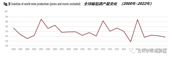 2022年,全球葡萄酒产量258亿升,较2021年下降了1%。总的来说,全球葡萄酒产量已连续四年稳定在260亿升左右。