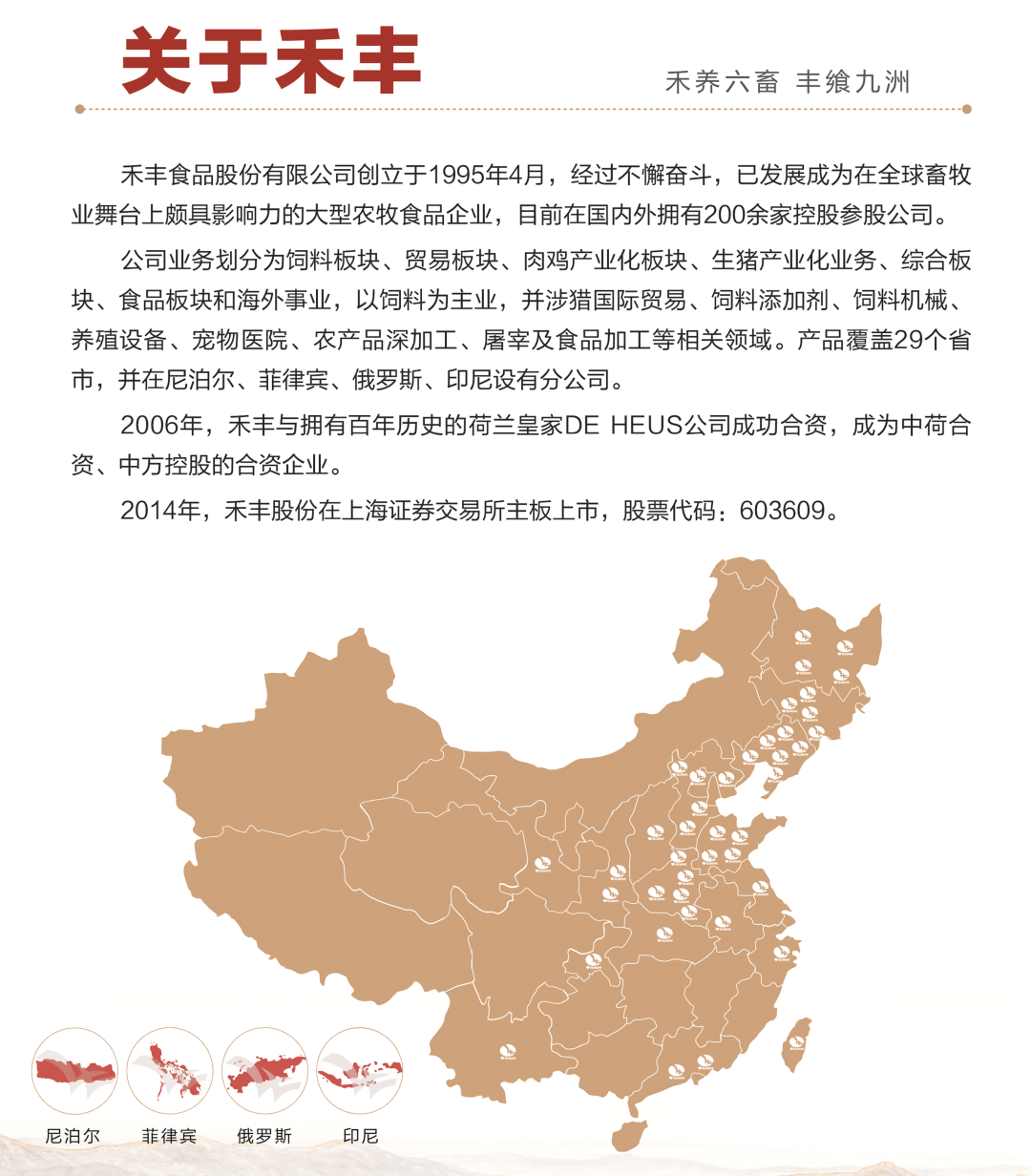 禾丰食品股份有限公司创立于1995年4月,经过不懈奋斗,已发展成为在全球畜牧业舞台上颇具影响力的大型农牧食品企业。目前拥有200余家下属企业,产品覆盖32个省市,并在尼泊尔、印尼、菲律宾、俄罗斯等国家设有工厂。2006年10月,拥有百年历史的荷兰饲料企业——皇家DeHeus公司与禾丰成为战略合作伙伴,在增强禾丰技术研发实力、丰富禾丰管理经验的同时使禾丰始终拥有国际化视野、享有国际化发展资源。2014年8月8日,“禾丰股份”于上海证券交易所成功上市,股票代码:603609。