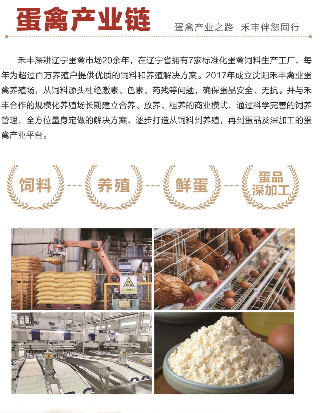 禾丰股份深耕辽宁蛋禽市场20余年,目前在辽宁省拥有7家标准化蛋禽饲料生产工厂,年产能力超百万吨。多年来凭借行业领先的企业实力和品牌美誉度,打造辽宁省蛋禽第一品牌。禾丰股份自养蛋鸡存栏120万羽,在辽宁省合作养殖场存栏超1200万羽。