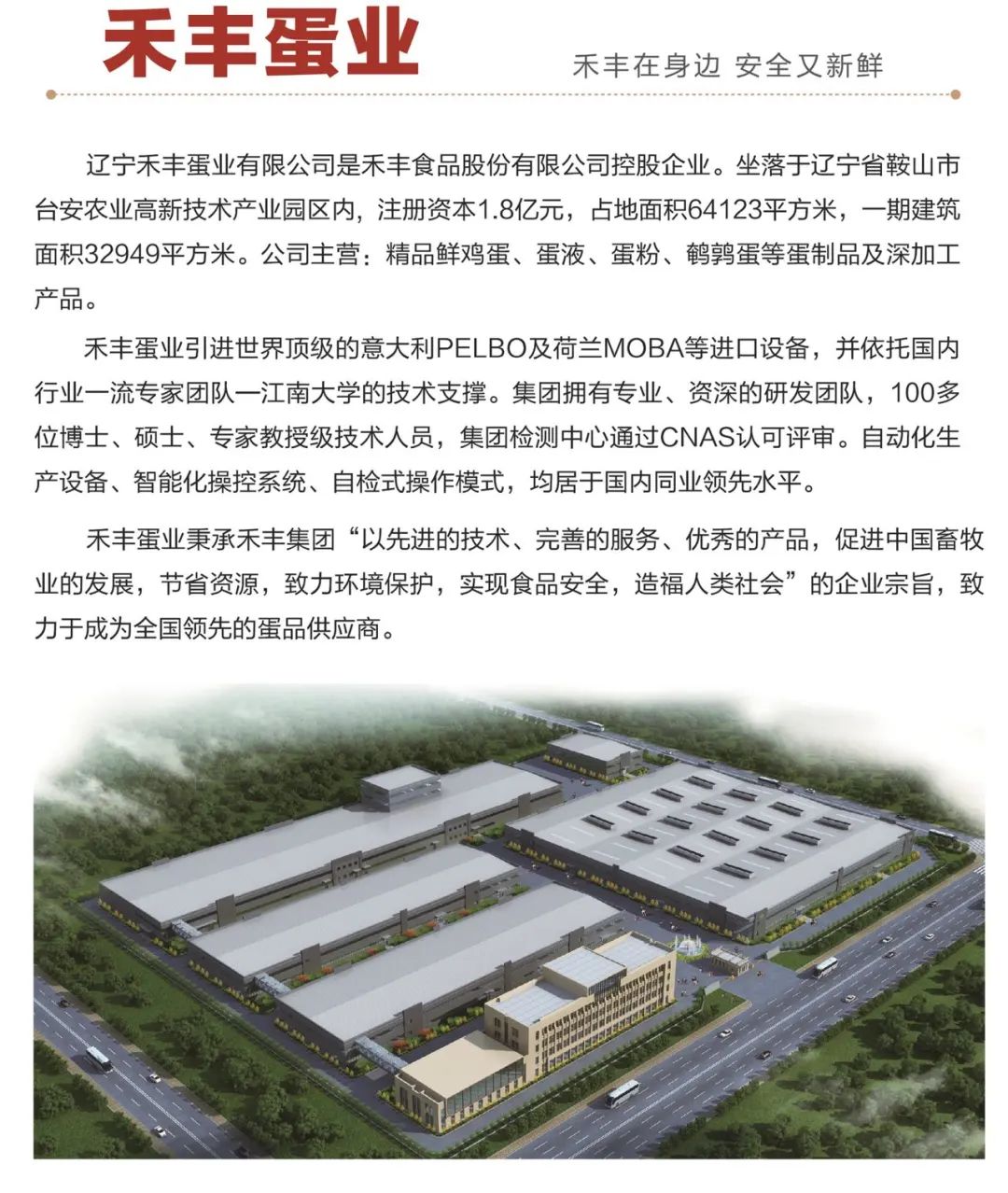 禾丰食品股份有限公司控股企业辽宁禾丰蛋业有限公司(禾丰蛋业)坐落于辽宁省鞍山市台安农业高新技术产业园区内,注册资本1.8亿元,占地面积64123平方米,一期建筑面积32949平方米。公司主营:精品鲜鸡蛋、蛋液、蛋粉、鹌鹑蛋等蛋制品及深加工产品。年深加工鸡蛋2.5万吨,鹌鹑蛋1.5万吨。禾丰蛋业引进荷兰MoBa等进口设备,持续优化自动化生产设备、智能化操控系统、自检式操作模式,并依托江南大学专家团队的技术支撑。集团拥有专业、资深的研发团队,100多位博士、硕士、专家教授级技术人员,集团检测中心通过CNAS认可评审。