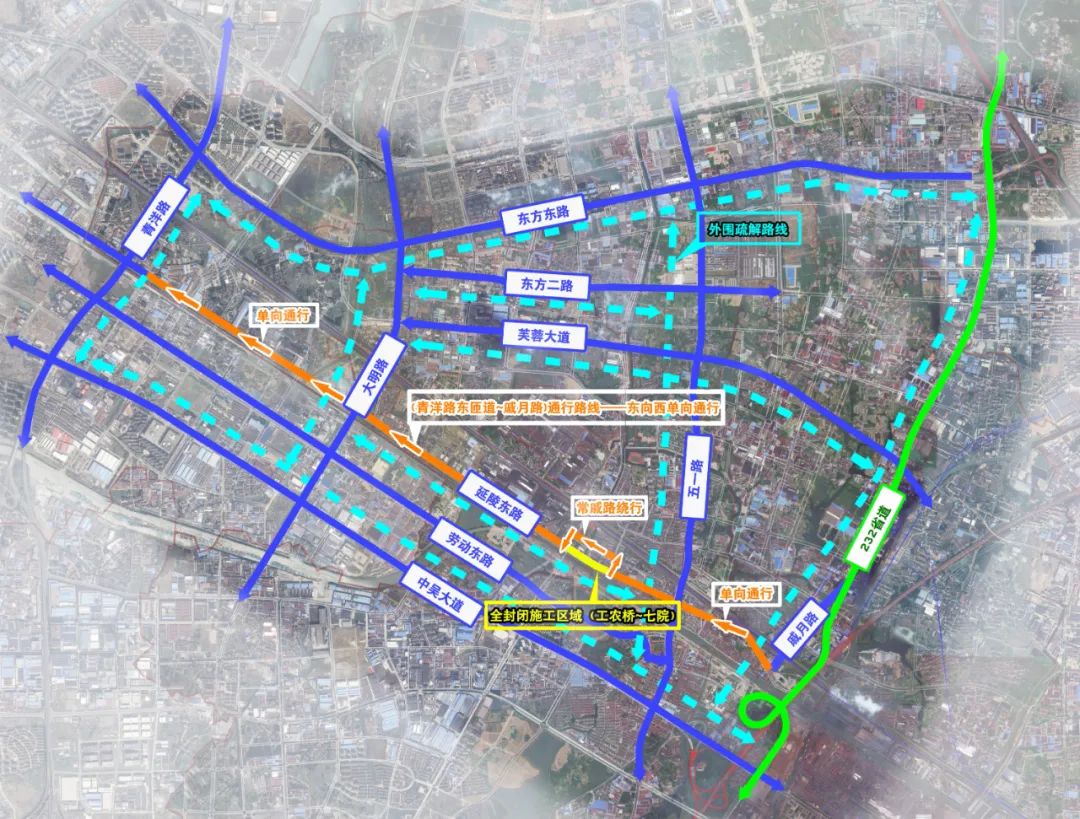 工农桥—常州七院段采用全封闭施工,计划时间为2023年7月1日至2023年8月10日,过往车辆通过常戚路绕行。