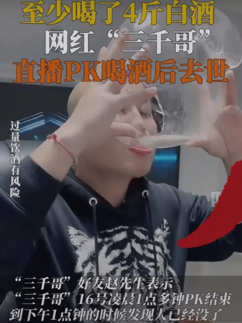 网红“三千哥”在最后一次打PK视频时,他喝了3瓶白酒之后,出现了明显的不适症状。但即便如此,他仍然手指着摄像机表示“我命由我不由天”,并继续喝下了第四瓶酒。不幸的是,最终他因为过度饮酒发生了不可挽回的悲剧。