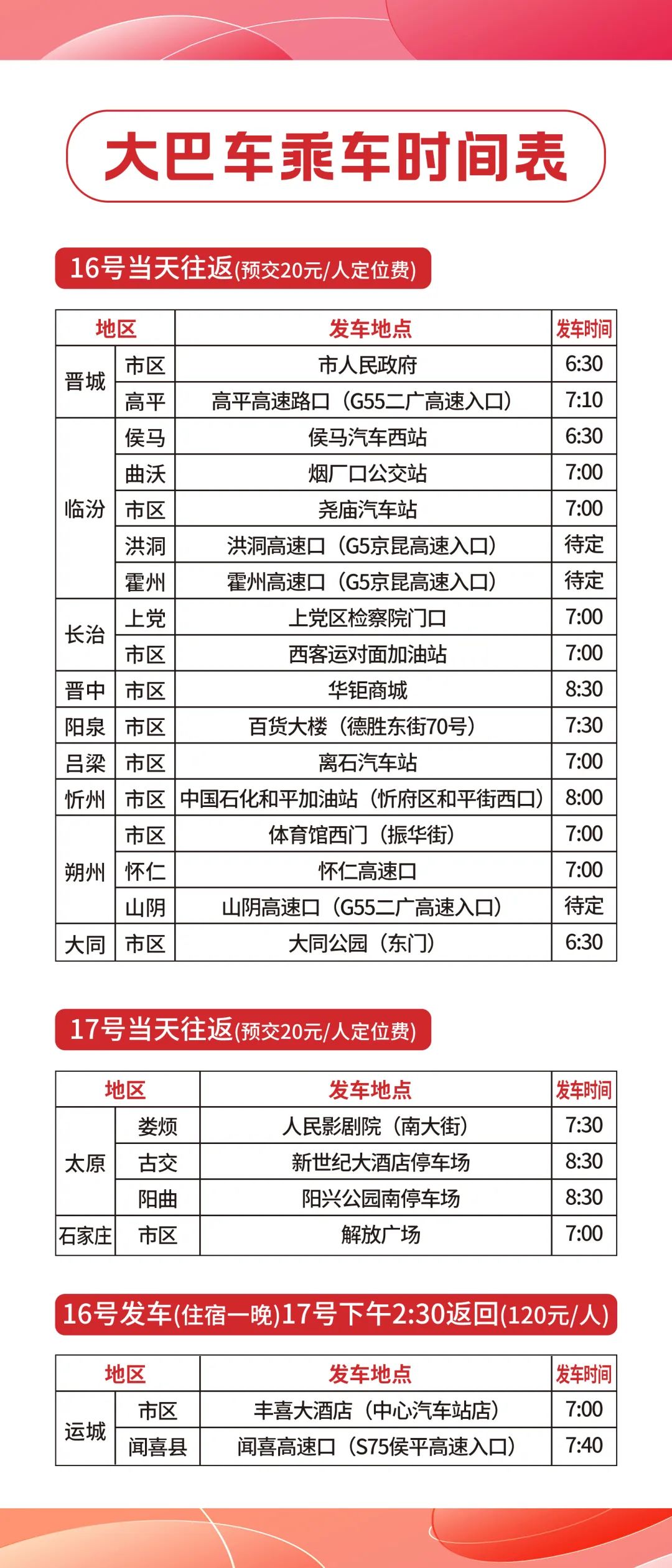 2023山西国际美博VIP大巴车接送服务,是为了方便专业买家参观出行而提供的免费服务。已完成预约的观众请仔细阅读下方时间表及乘坐地点,以免漏乘