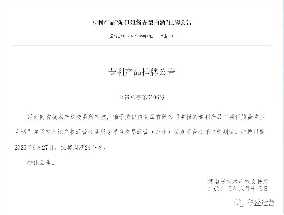 专利产品“媚伊娘酱香型白酒”挂牌公告