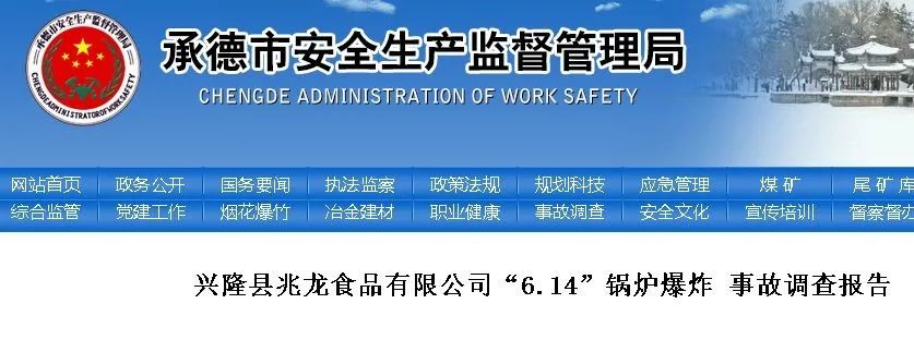 2017年6月14日2时左右,兴隆县兆龙食品有限公司锅炉发生爆炸,造成1人死亡,直接经济损失约人民币120万元。