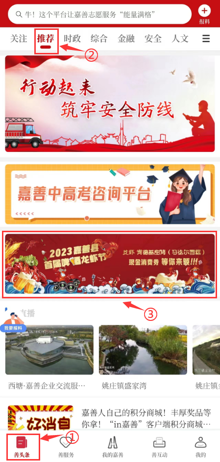 打开“in嘉善”客户端,点击底部“善头条”按钮,在“推荐”版块点击“2023嘉善县首届啤酒龙虾节”活动页面进行领取。