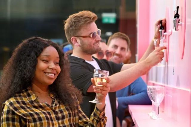 英格兰西北部的曼彻斯特是英国最大的桃红葡萄酒爱好者地区,当地时间下午1点左右,温度达到理想的19.2摄氏度,安装在广告牌前面的水龙头开始免费供应桃红葡萄酒。