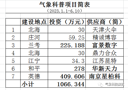 2.庄河市气象局采购“庄河市气象局科普馆建设项目”,中标金额:59.25万元,供应商:北京精诚博容文化发展有限公司。开标公示时间:6月5日。