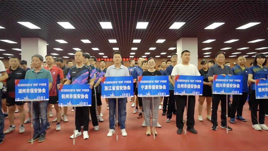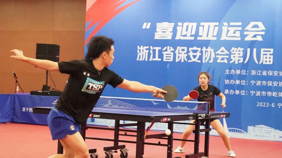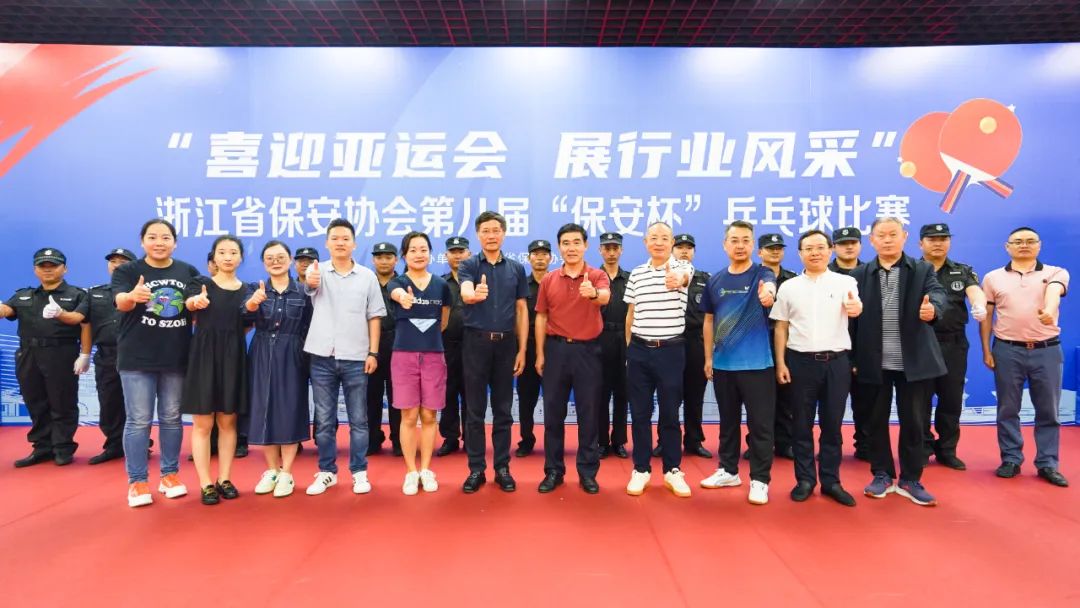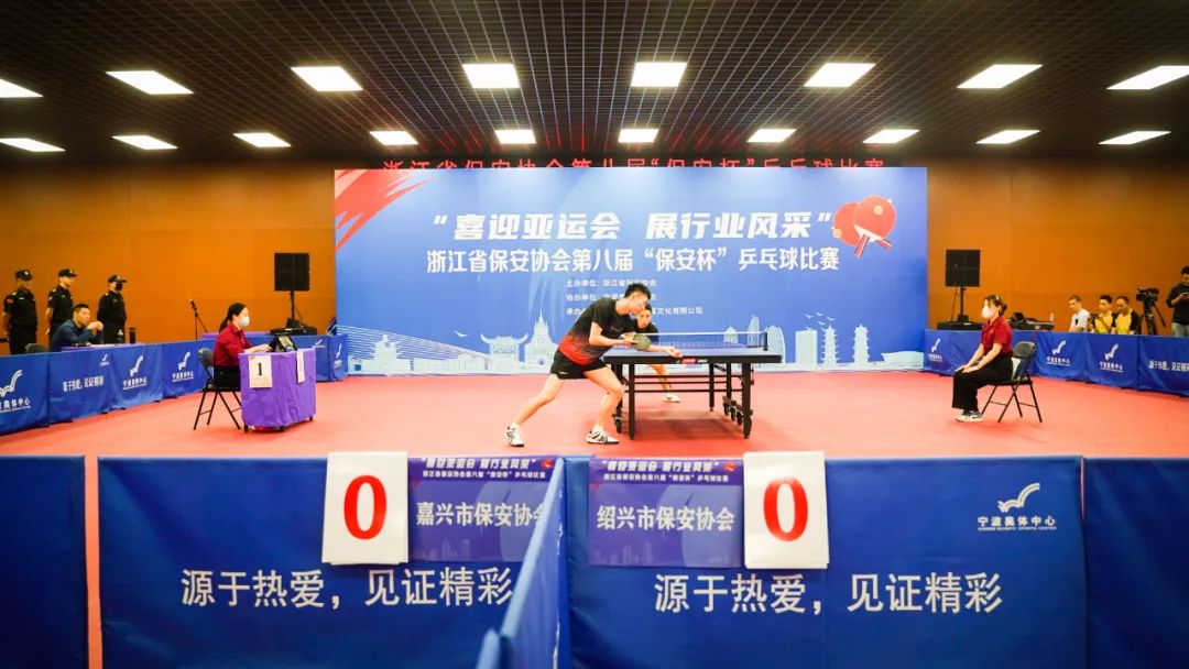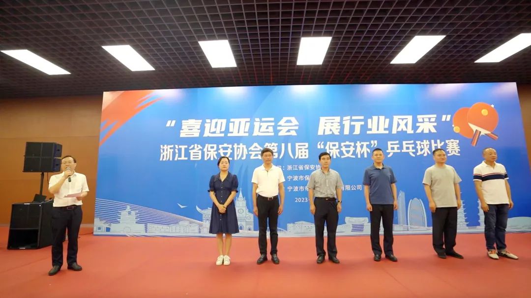2023年6月8日、9日,“喜迎亚运会 展行业风采”浙江省保安协会第八届“保安杯”乒乓球赛在宁波奥体中心成功举办。本次比赛由浙江省保安协会主办,宁波市保安协会协办,来自省市保安协会12支代表队参赛。宁波市公安局治安支队副支队长傅再锋致欢迎辞。他表示,今年是特殊而重要的一年,我们迎来了备受瞩目的亚运会,本届“保安杯”乒乓球比赛,不仅展现了乒乓球运动的热爱和追求,更是展示保安行业风采、凝聚保安力量的重要平台。