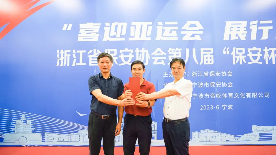 宁波市公安局治安支队一级高级警长、宁波市保安协会会长蔡纪宏将下一届赛事协办方的接力棒交到舟山市保安协会秘书长俞庆本手中,顺利完成了“交接棒”的传递工作。
