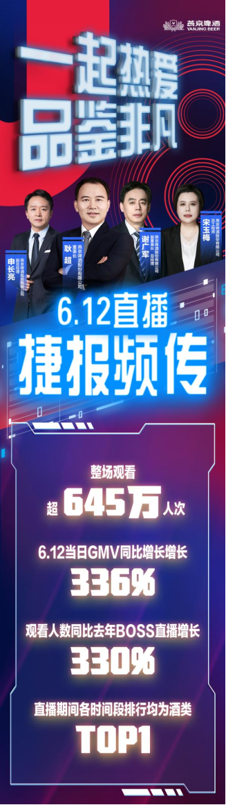 “董事长来了!一起热爱,品鉴非凡!”,2023年6月12日燕京啤酒618电商直播再次引爆炎炎夏日,燕京啤酒党委书记、董事长耿超领衔高管团队豪华阵容亮相直播间,与消费者分享啤酒知识以及相关品酒文化,并通过一系列互动话题、抽奖、带货活动,拉近了与消费者之间的距离,提高品牌618曝光量的同时,传播燕京品牌“热爱有你”的企业文化。