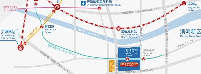 国家会展中心(天津)北临城市天然轴线的海河,东至卫津河,南至天津大道,西至宁静高速。展馆周边交通发达,多条高速和各等级公路交汇于此, 地铁一号线直达展馆,北洋村及国展路站2019年底已正式开通,客商自北京可快速便捷到达展馆。