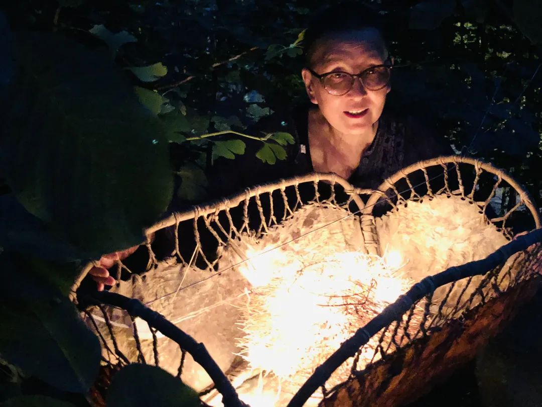 一个来自非洲的用皮子做成的老旧摇篮,庆庆老师把这个皮子从非洲旅行到中国的古老摇篮做成灯光装置,摇篮中间放着一个闪烁灯光的鸟巢,曾经有多少可爱的生命在此中成长……