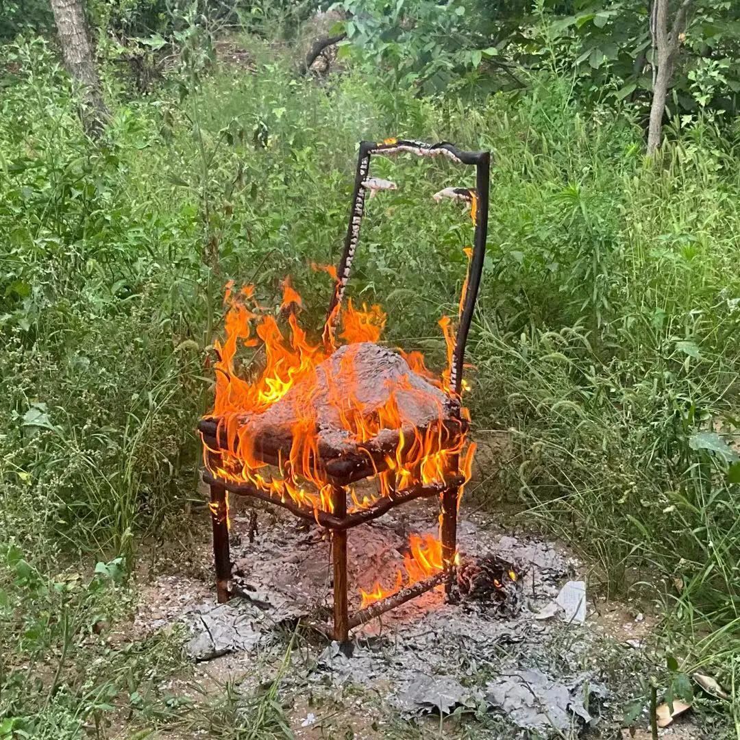 郭志锋:行为过程是面对着椅子和椅子上的两本书读一首诗,然后把诗稿和椅子和书一起点燃,烧成灰烬,埋进泥土里,给它们立一块简陋的木牌作为墓碑