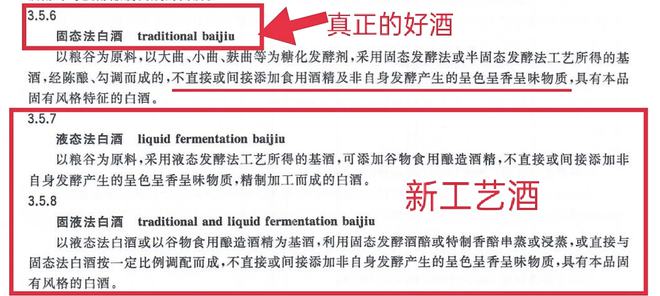 固态法白酒的生产标准最高,酿造工艺传统老旧,不添加任何食用酒精和添加剂,是真正的“纯粮食酒”;液态法、固液法白酒则采用新工艺,可以勾兑食用酒精,也叫新工艺白酒。