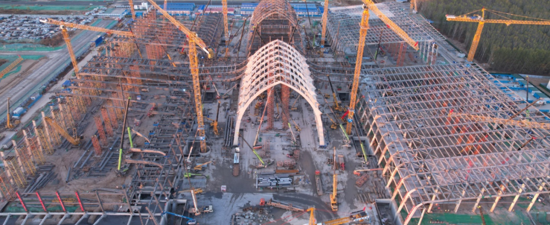 临空会展项目涵盖钢结构、楼承板、防火涂料、约束支撑、抗震支座、钢拉索、钢拉杆等诸多施工内容,为保证该项目于2023年5月办展,项目工期仅有45天。