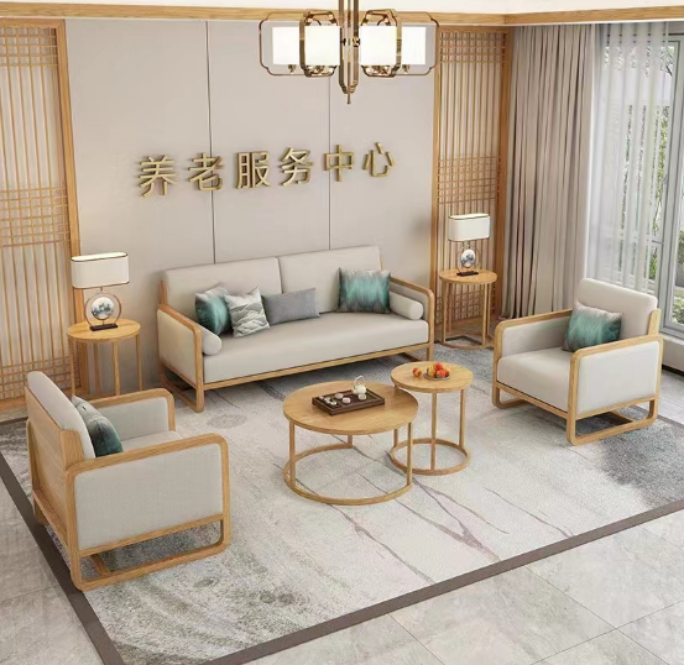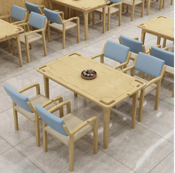 餐桌椅:无任何尖角,全部倒角处理,防止老人刮伤;扶手能自然“托着”肘腕,让肘关节、腕关节得到休息;扶手处可设有拐杖孔,方便老人放置拐杖;软包软硬适中,防止引起臀尖疼痛;基材采用进口橡胶木,含水率12%以下,防止家具变形