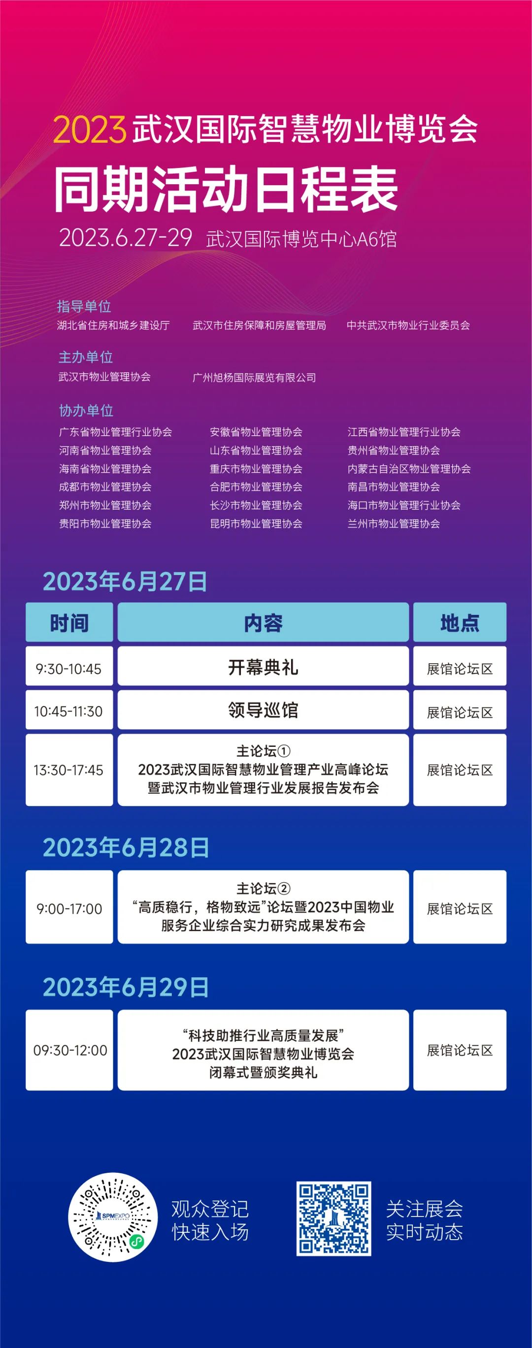 2023武汉国际智慧物业博览会将于2023年6月27-29日,在武汉国际博览中心盛大开幕!预计展会规模达到11000平方米,汇聚全球200+家物业产业上下游企业,同期多场高端专业活动,引燃行业关注,将吸引来自全国的10000+专业买家到场参观。
