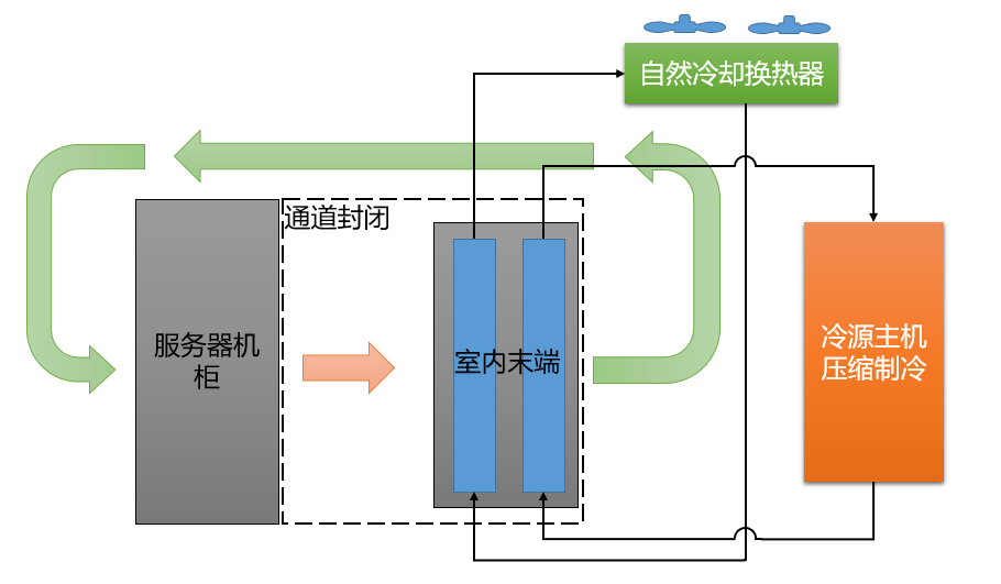 通过背板封闭或通道封闭的搭建,利用热通道与室外环境的天然温度差,结合 0 输送功耗重力热管技术最大化利用自然冷源,在室外温度高达30度的情况下仍可利用自然冷源,最大化减少了压缩机的持续运行时间。