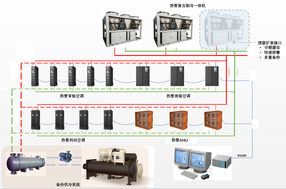 对高可靠性要求的机房,采用该方案的提供可以使用如下双冷源构架的部署结构,使用主系统优先接入自然冷却复合主机设备,结合冷水机组等多种冷源方案,轻松实现2N的高可靠性构架。