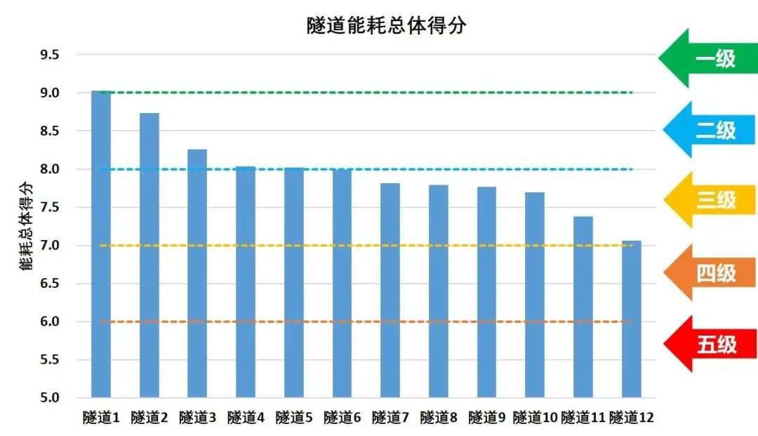 从隧道用电量合理性和用电均衡性维度出发,一方面是预测每条隧道合理的用电量区间,另一方面是分析隧道用电峰、平、谷占比,反映设施用电配置的合理程度,综合得到隧道能耗评分评级,形成《城市隧道能耗分析报告》。