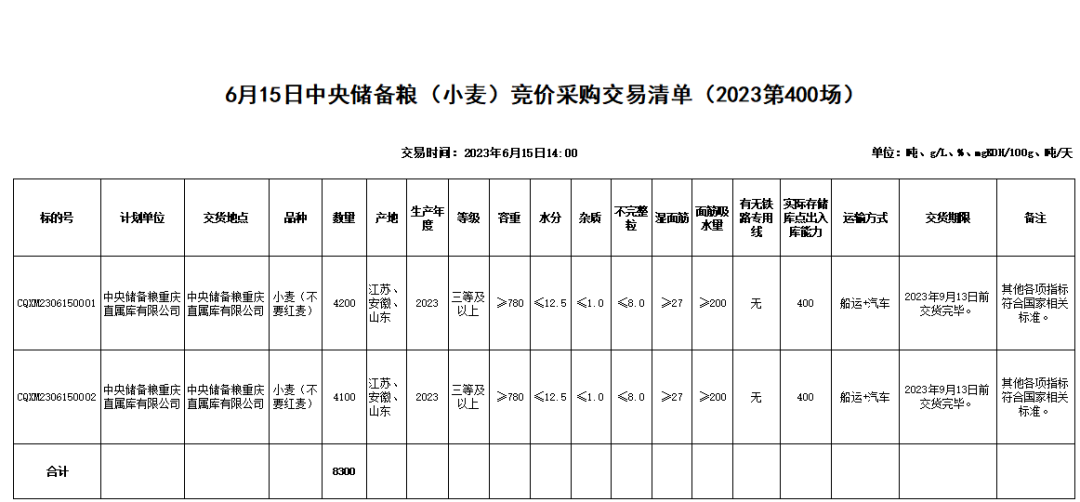 受中国储备粮管理集团有限公司成都分公司委托,重庆市粮油批发市场有限责任公司(即国家粮食重庆交易中心,以下简称“批发市场”)定于2023年6月15日14:00举办中央储备粮(小麦)竞价采购交易会,现将有关事项公告如下:
