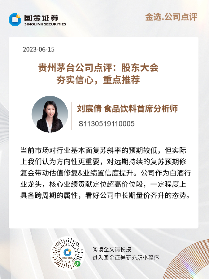 当前市场对行业基本面复苏斜率的预期较低,但实际上我们认为方向性更重要,对远期持续的复苏预期修复会带动估值修复&业绩置信度提升。公司作为白酒行业龙头,核心业绩贡献定位超高价位段,一定程度上具备跨周期的属性,看好公司中长期量价齐升的态势。