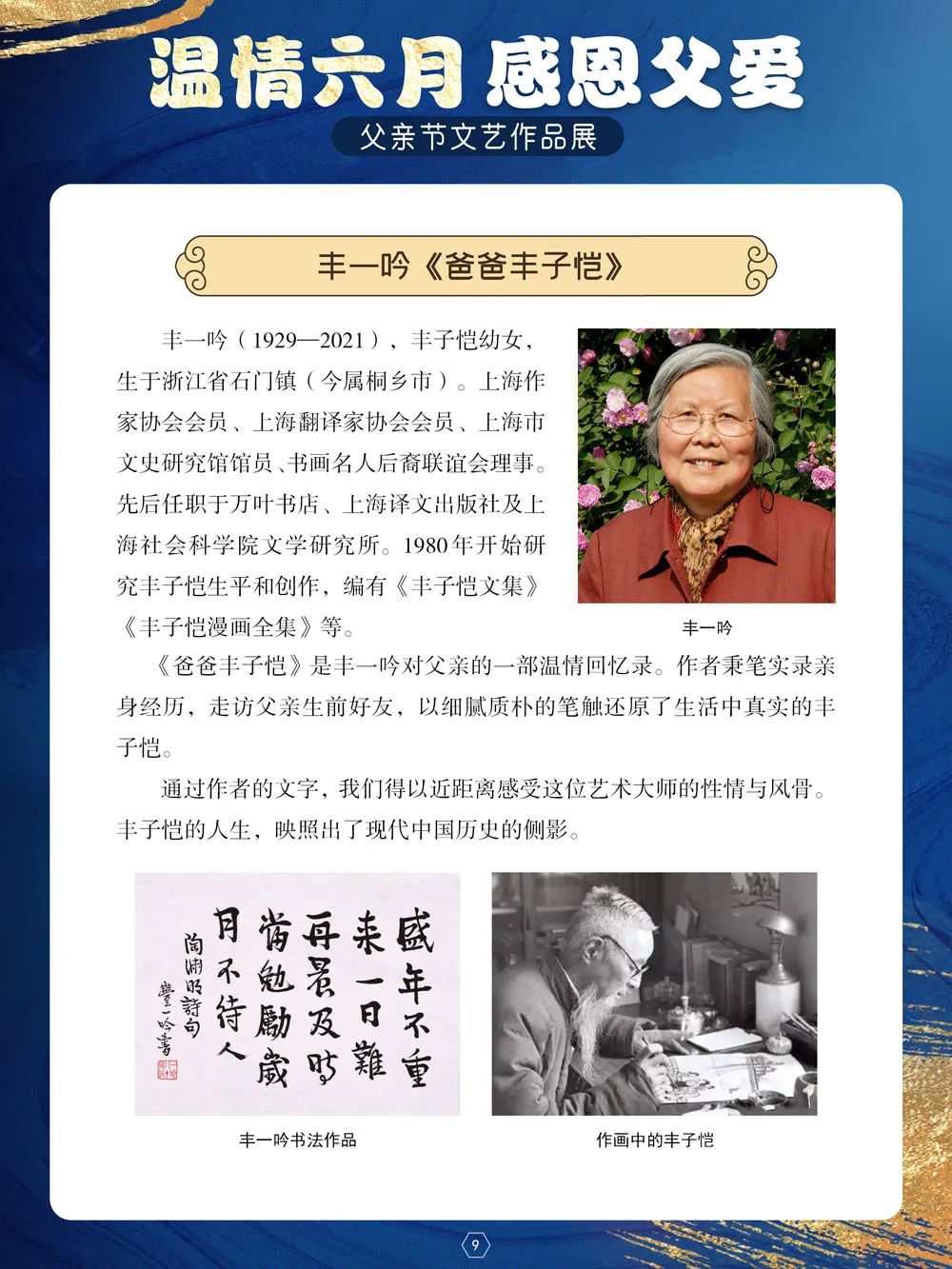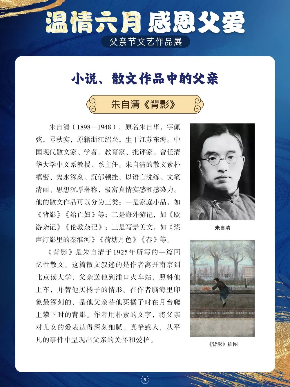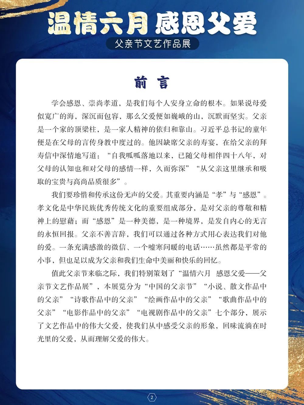 如果说母爱似宽广的海,深沉而包容,那么父爱便如巍峨的山,沉默而坚实。感恩如山父爱,学会用心关怀。弘扬和践行中华孝道文化,唤醒对父亲的崇敬之意,牢记父亲的养育之恩、教育之恩。值此父亲节来临之际,我们特别策划了“温情六月 感恩父爱——父亲节文艺作品展”,本展览分为“中国的父亲节”“小说、散文作品中的父亲”“诗歌作品中的父亲”“绘画作品中的父亲”“歌曲作品中的父亲”“电影作品中的父亲”“电视剧作品中的父亲”七个部分,展示了文艺作品中的伟大父爱,使我们从中感受父亲的形象,回味流淌在时光里的父爱,从而理解父爱的伟大。