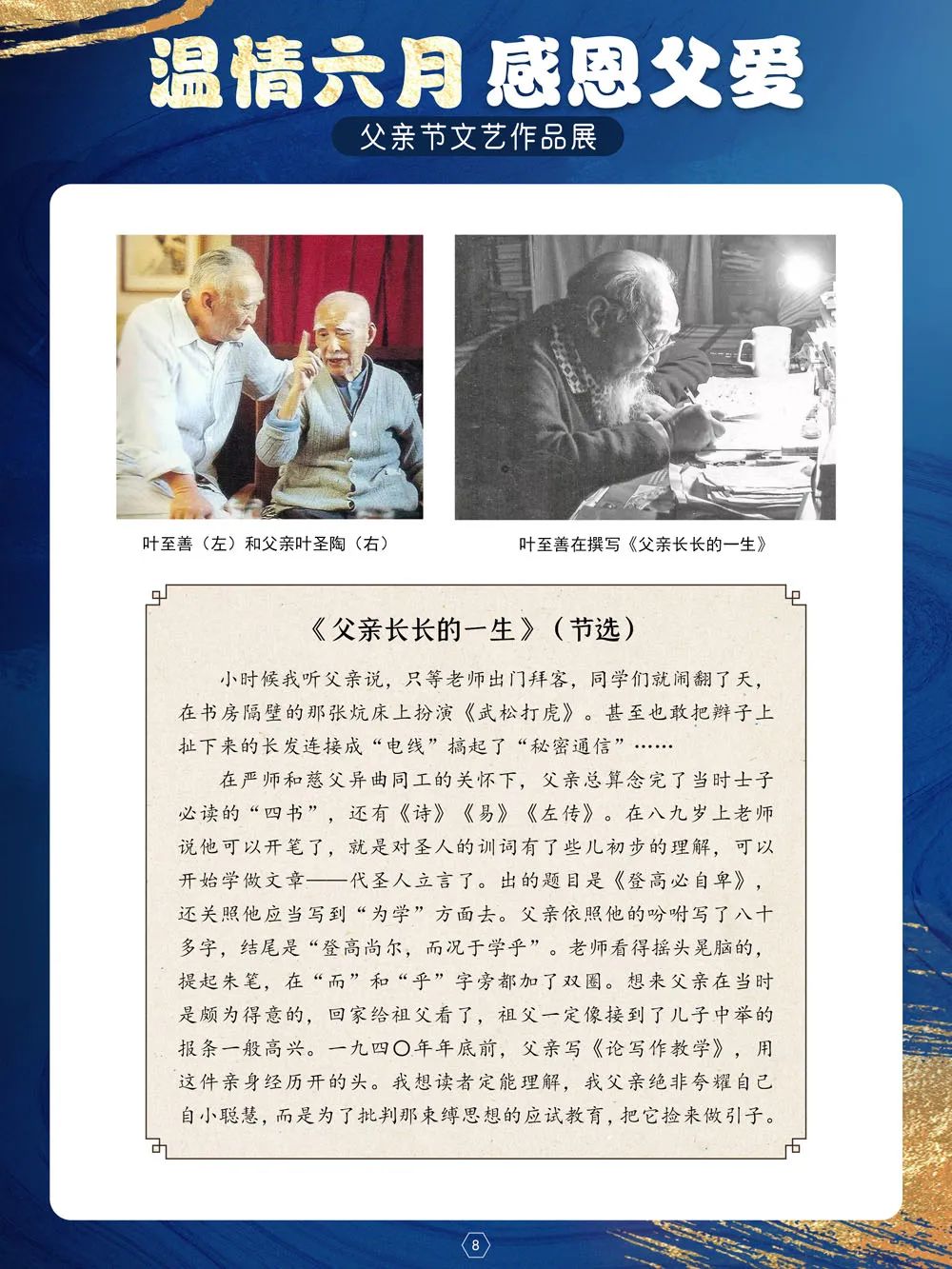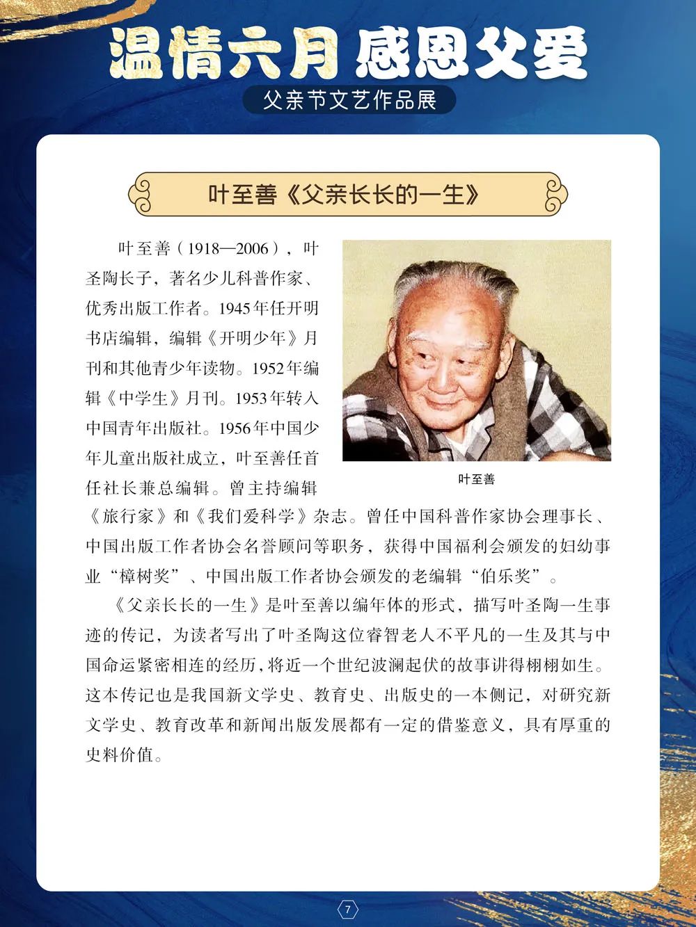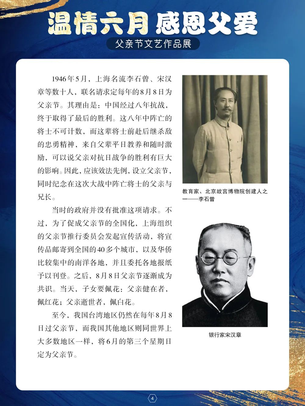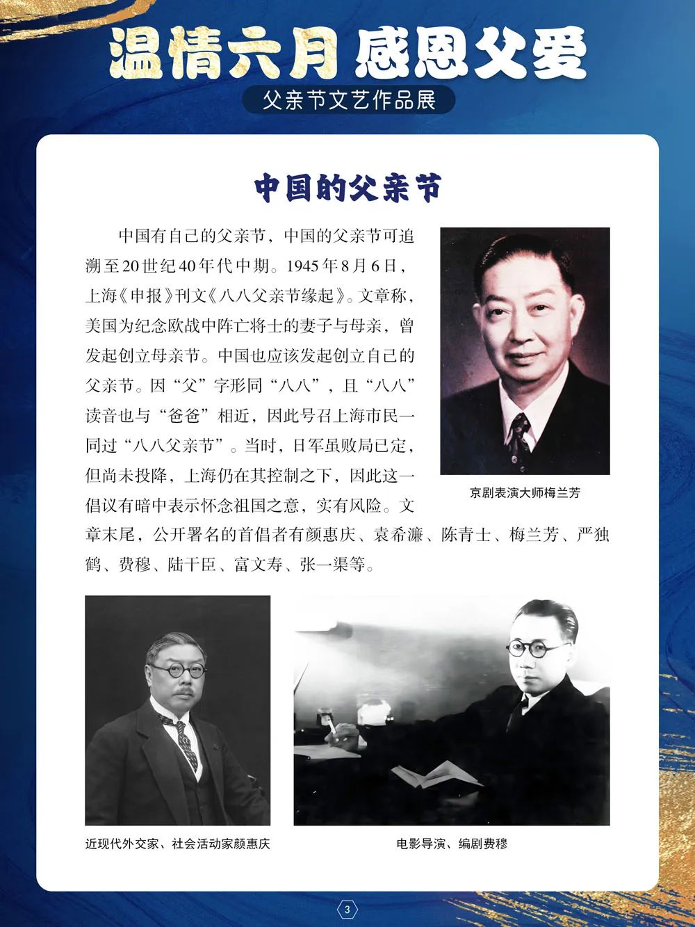 如果说母爱似宽广的海,深沉而包容,那么父爱便如巍峨的山,沉默而坚实。感恩如山父爱,学会用心关怀。弘扬和践行中华孝道文化,唤醒对父亲的崇敬之意,牢记父亲的养育之恩、教育之恩。值此父亲节来临之际,我们特别策划了“温情六月 感恩父爱——父亲节文艺作品展”,本展览分为“中国的父亲节”“小说、散文作品中的父亲”“诗歌作品中的父亲”“绘画作品中的父亲”“歌曲作品中的父亲”“电影作品中的父亲”“电视剧作品中的父亲”七个部分,展示了文艺作品中的伟大父爱,使我们从中感受父亲的形象,回味流淌在时光里的父爱,从而理解父爱的伟大。