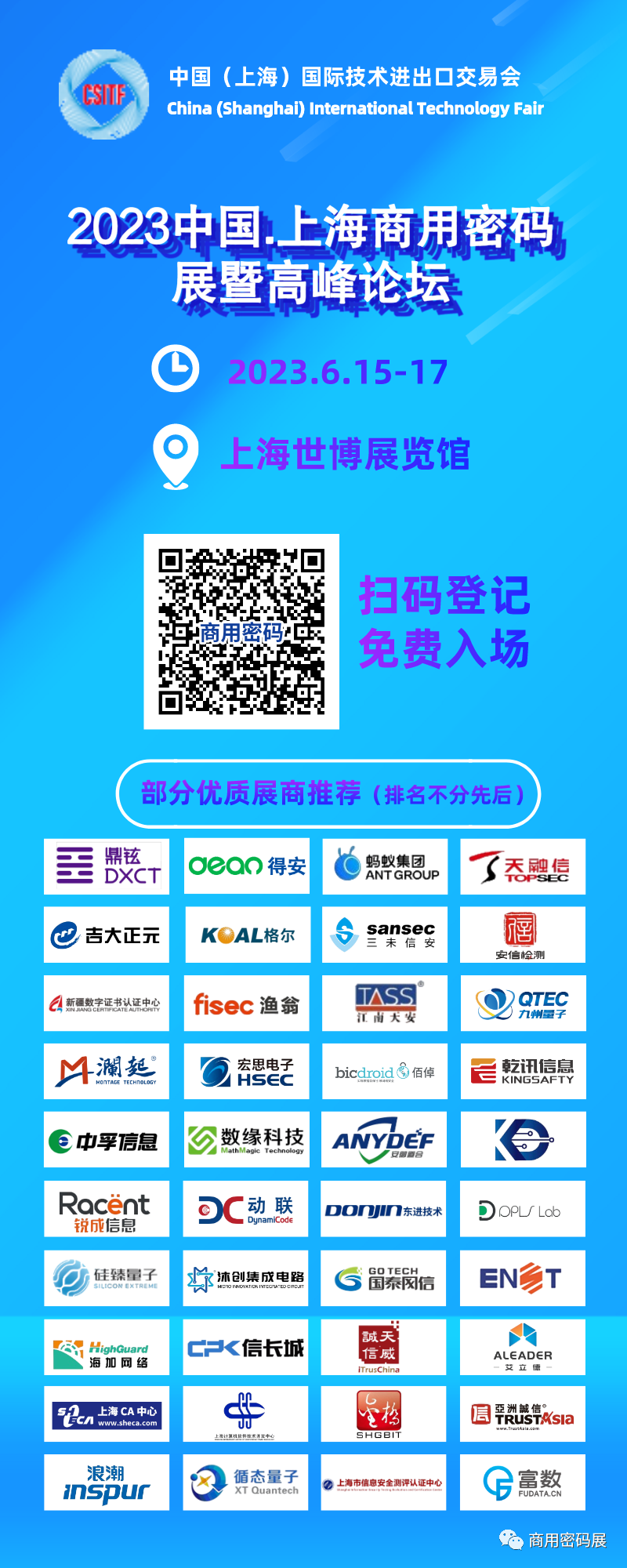 2023中国.上海商用密码展暨高峰论坛,将于2023年6月15日-17日,在上海世博展览馆举办。在上海市密码管理局的指导下,上海市商用密码行业协会将主办题为“数智时代,万物因密而安——商用密码护航数字经济新发展”高峰论坛。通过专业展览、论坛分享双效平台,并为参展参会单位设置了新技术、新产品发布、专访等服务环节,展示和发布最新的科技创新项目和成果,探索商用密码新的应用场景,为以高质量科技创新支撑引领高质量发展贡献力量。